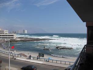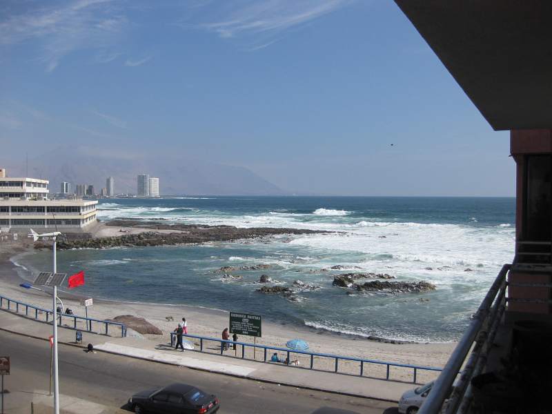 After more than 30 hours in airplanes and airports, we finally arrived tired however happy in Iquique, Chile on Wednesday 6th of October. First confusion started when the promised pick-up service, arranged by the language school didn't show up. However finally we managed to get a black taxi to get to our host mum - with a driver that refused accepting any money after the 40 min. drive - we only had to sign a voucher. Our host mum Rebecca already waited outside the building and gave us a warm welcome.The tower block located directly at the beach! Our room in Rebecca's apartment has a door to a balcone with sea view, we can even smell the Ocean in the night ...
