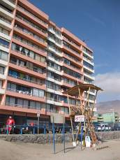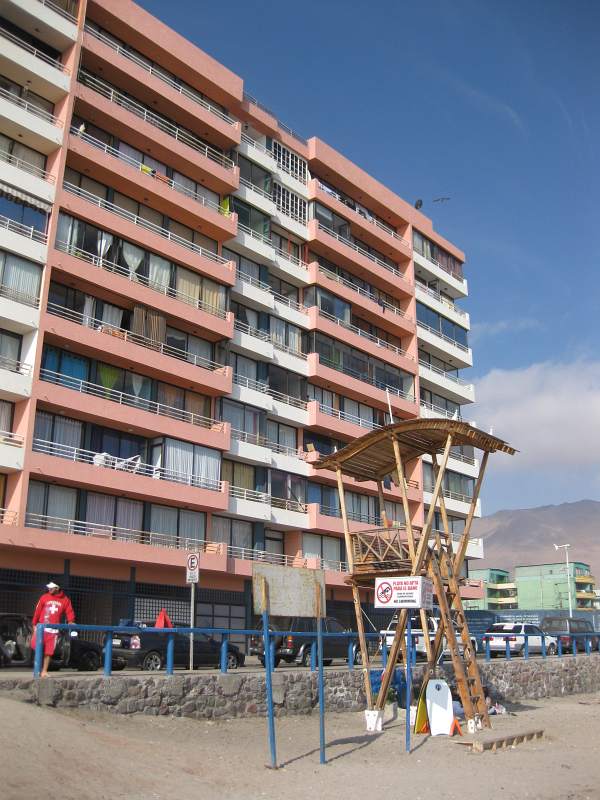 Nach mehr als 30 Stunden Fliegen und Warten auf Anschlussflüge kamen wir müde aber glücklich am Mittwoch 06.10 in Iquique, Chile an. Es hat ein bisschen Verwirrung gestiftet, dass der von der Sprachschule versprochene Abholservice nicht da war. Aber am Ende haben wir es geschafft mit einem "schwarzen" Taxi zu unserer Gastmutter zu fahren -mit einem Fahrer, der dann nach der 40-minütigen Fahrt auf keinen Fall Geld von uns annehmen wollte... Wir mussten dann nur einen "Gutschein" unterschreiben ohna Angabe jeglicher persönlicher Daten. Unsere Gastmutter wartete schon vor dem Gebäude auf uns und hat uns ganz herzlich begrüßt. Der Turm is direkt am Strand! Unser Zimmer in Rebecca's Wohnung hat einen Balkon mit Meerblick -wir können den Ozean nachts sogar riechen...