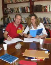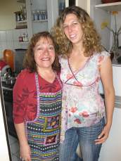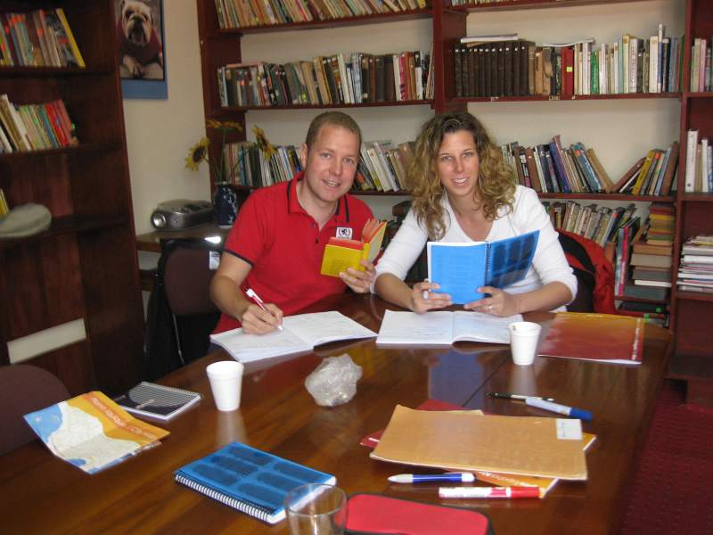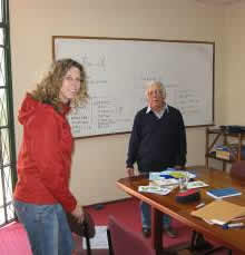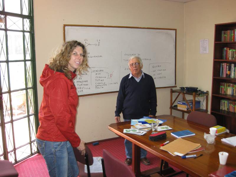 Wir haben nun schon unseren dritten Tag im Spanischkurs hinter uns gebracht..Wow! Sooo viele Informationeen, dass unsere Köpfe sich wie "Spaghetti" anfühlen -wie unsere Lehrer Jorge (gesprochen "Chorche") sagt. Keine Chance, dass wir uns das alles auf einmal merken können.. Wir werden wohl später auf der Fahrt noch daran arbeiten müssen... Wir haben auch noch ein paar neue Fotos: Jenny mit der Gastmutter Rebecca: Ihr "pollo" (Hühner-) Mittagessen mit "Pisco Sour"-Cocktail sind echt lecker! -fantastico! Die zwei anderen Fotos haben wir in der "Academia" gemacht. Da sieht man mal, wie fleißig wir hier sind!!! '