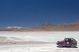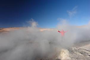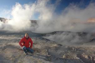 Es ging also los und wir haben die Grenzen ohne Probleme mit dem Papierkram uebertreten -puh! Wir fuhren in den Reserva Nacional de Fauna Andina, wo wir Salzseen, Flamingos und Tatio-Geysire sahen. Wir hatten uns entschieden bei den Geysiren zu zelten, obwohl die Temperaturen nachts auf unter Null sinken -brrrrrrr. Leider haben wir beide (Ben noch mehr) dann erlebt, wie sich die Hoehenkrankheit anfuehlt -Kopfschmerzen, Magendruecken, Muedigkeit, Kraftlosigkeit. Wir hatten den Aufstieg von 2500m auf 3800m unterschaetzt. Zusaetzlich wurde es leider -14 Grad (!!) kalt und die fast schlaflose nacht schien dadurch noch endloser. Morgens bei Sonnenaufgang schauten wir uns die Geysire an. Es war doch ein bischen schade, dass wir gerade an diesem morgen feststellen mussten, dass unsere Heizung im Auto kaputt gegangen war...
