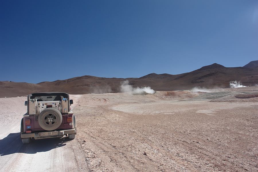 Donnerstag 04.11.10 - Suedbolivien: Geisiere Sol de Manana, unser Jeep blieb mal wieder liegen - und ein sehr hilfsbereiter Zollposten 5200m Hoehe