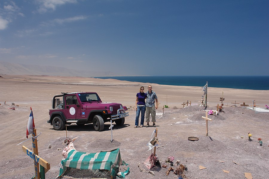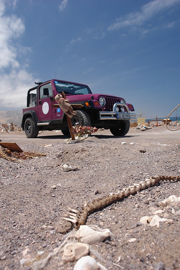 Am Freitag fuhren wir, mit dem Plan in San Pedro de Atacama anzukommen, weiter. Aber wir haben ja URLAUB und da haben wir uns Zeit gelassen. Wir sind die Küstenstrasse entlang gefahren und haben an einem Haustierfriedhof gehalten -das war echt spooky; teilweise lagen auch Skelettknochen herum.