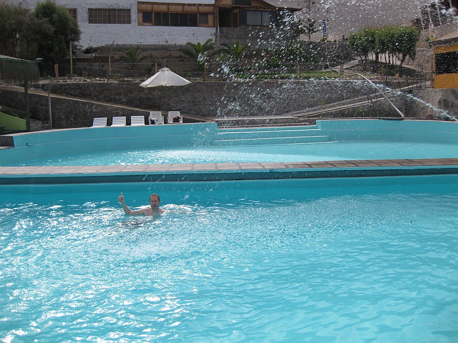 Nachdem wir das Auto am Montag abgeholt hatten und wussten, dass nix geklaut war, mussten wir noch die letzten Campingsachen einkaufen. Das war sooooooooooooooo viel schwieriger als wir gedacht hätten. Am Dienstagabend waren wir echt ko und beschlossen einfach noch eine Nacht auf dem Campingplatz südlich von Iquique zu bleiben. Weil wir immer noch ein paar Dinge besorgen mussten und der Campingplatz sooo schön war, blieben wir noch einen... zwei Tage länger. Wenn die Sonne mal durch die Wolken kam, konnten wir sogar im Pool schwimmen gehen -Morgensport oder so...