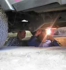 Ben versuchte die Wasserpumpe (!!) zu reparieren -wieder mal-, aber leider halfen alle Anstalten nichts... Am Ende hatten wir Glueck und konnten die Zollstation nochmal erreichen, wo es einen Mechaniker gab. Der stellte fest, dass das Thermostat kaputt gegangen war und baute es vorerst aus. So konnten wir ins naechste Dorf weiter fahren -vier Stunden fahrt ueber Schotter-, Stein- und Sandpisten. Dort ruhten wir uns gut aus, obwohl wir dort nochmal einen Schock erlitten: Ben's Laptop ging VOLLKOMMEN kaputt und gerade in dem Moment in dem er einen Backup fuer alle Fotos seit Beginn unserer Reise machen wollte -ALLES IST WEG!!!