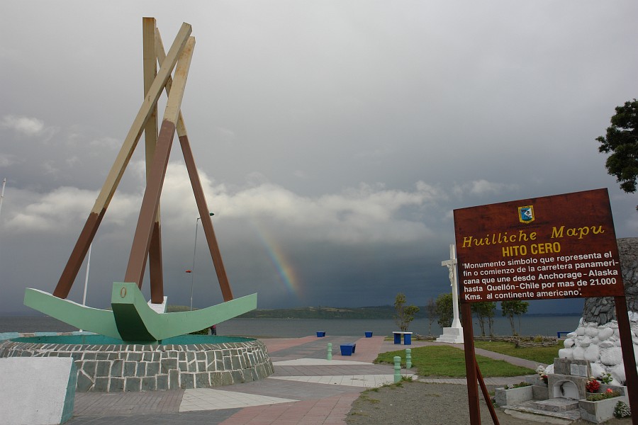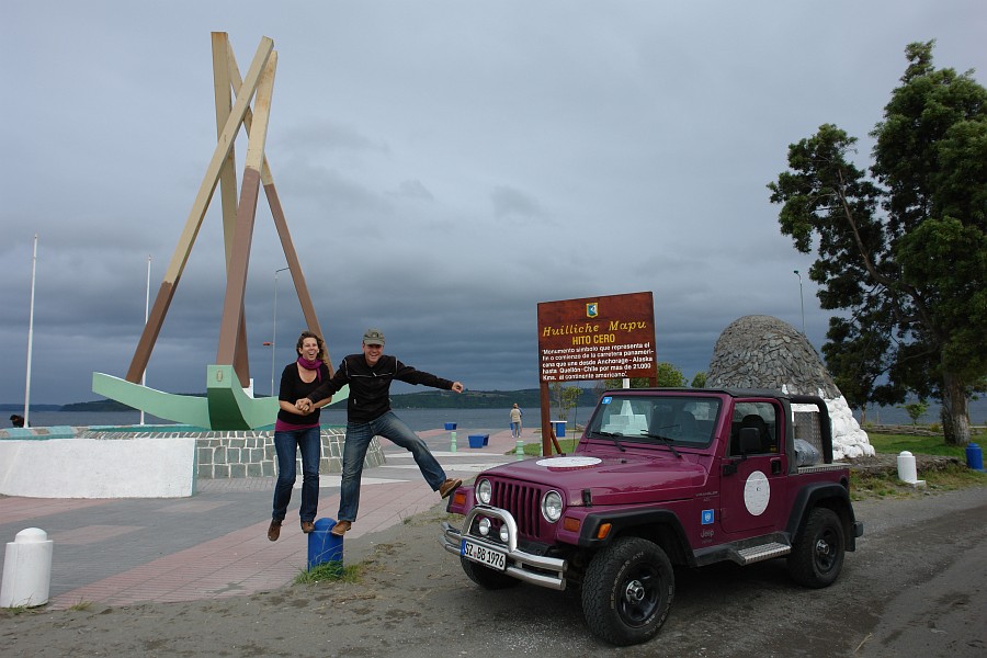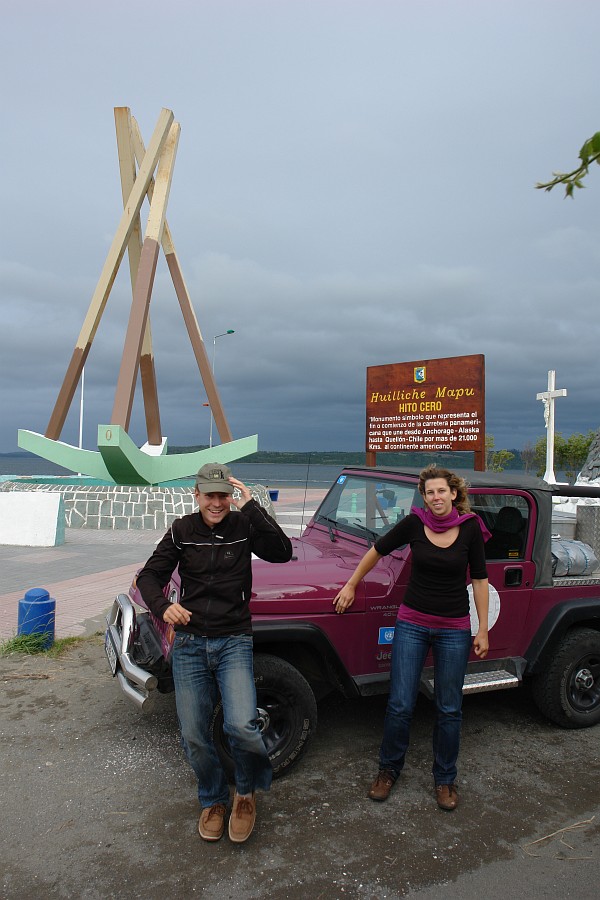 Ein paar Kilometer südlich von Quellon liegt das Ende der Panamericana -beeindruckendende 21.000 Kilometer nach ihrem dem Anfang in Anchorage, Alaska. Natürlich mussten wir Bilder von diesem wichtigen Ort machen. Unsere Versuche bei Aufnahme in der Luft zu sein sind zwar missglückt, aber es hat richtig Spaß gemacht.