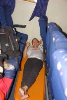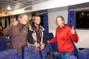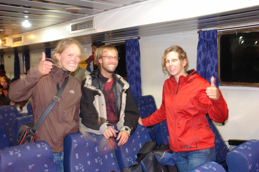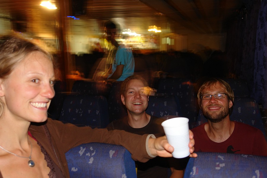 Die Abfahrt der Fähre wurde wegen schlechten Wetters von 15 Uhrauf 18 Uhrverschoben (wann ist es hier denn mal nicht schlecht?). Die Fahrt sollte sechs Stunden dauern, aber wir kamen doch erst um einiges später an. Ca um 22 Uhr gab es ein Durchsage -nur auf Spanisch natürlich, die erklärte, dass wir wegen des stürmischen Wetters in einem Hafen anlegen müssten und die Fahrt am nächsten Tag weiter ginge. Die Chilenen schienen gar nicht überrascht zu sein. Deshalb dauerte es auch einige Zeit bis wir kapierten, was los war. Zum Glück sind wir ja Camper. Wir holten unsere Isomatten und Schlafsäcke raus und machten es uns auf dem Boden gemütlich. Wir schafften es sogar Alkohol reinzuschmuggeln. Wir fühlten uns wie im Schulandheim als wir heimlich Pisco tranken. Am nächsten Tag kamen wir mittags mit 12 Stunden Verspätung in Chaiten an.