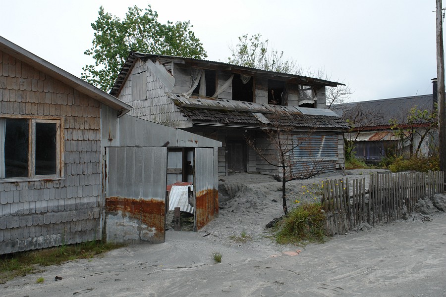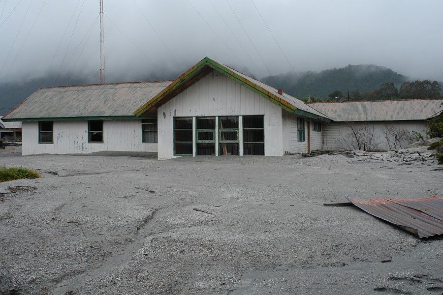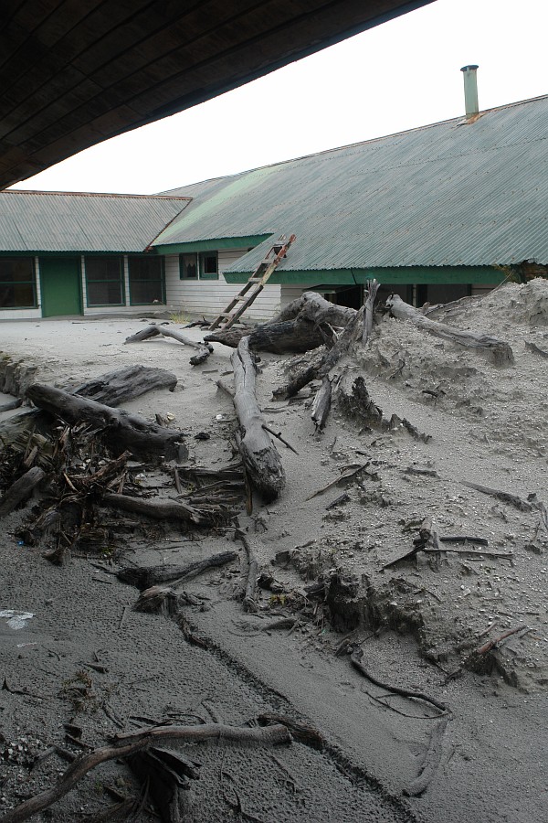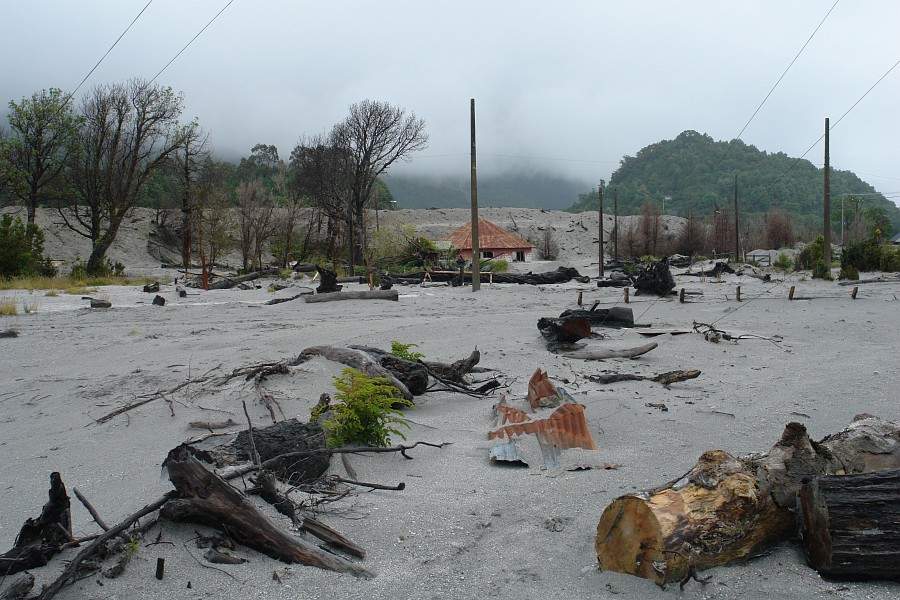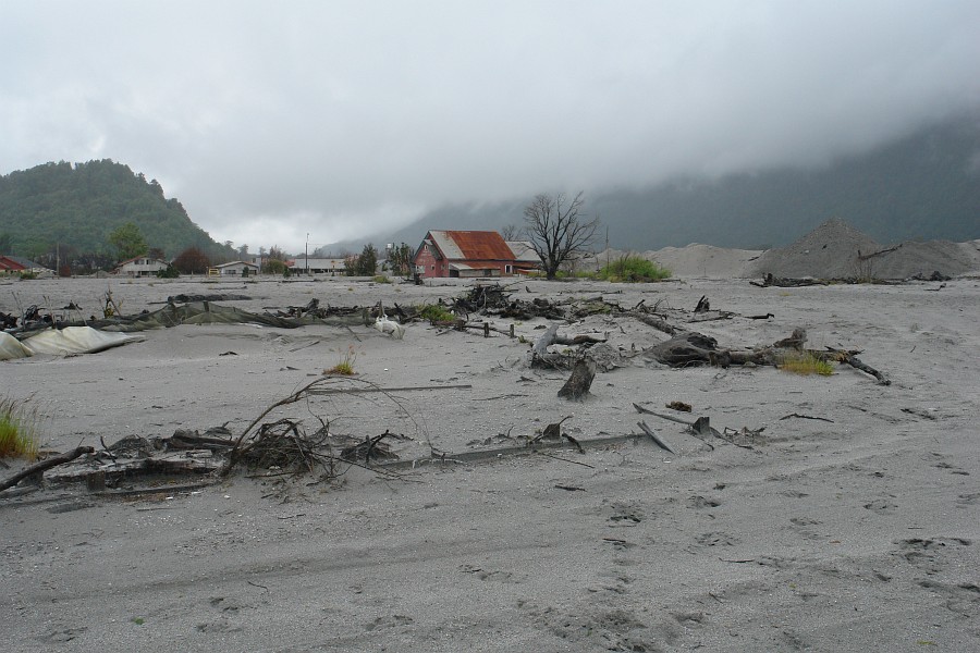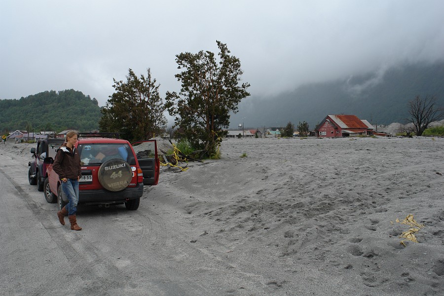 Ankunft in Chaiten: Die Stadt ist seit dem Vulkanausbruch des Volcano Chaiten am 2. Mai 2008 weitgehend verlassen. Der Vulkan war eigentlich als erloschen deklariert worden nachdem der letzte Ausbruch 9000 Jahre her gewesen war, aber 2008 ist er 10km vor Chaiten ausgebrochen und schleuderte Asche bis zu 20m in die Höhe. Innerhalb eines Tages war Chaiten von einer 20cm dicken Ascheschicht überzogen.