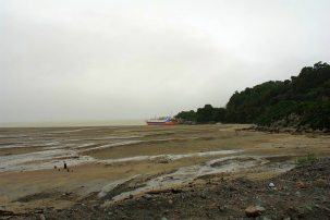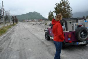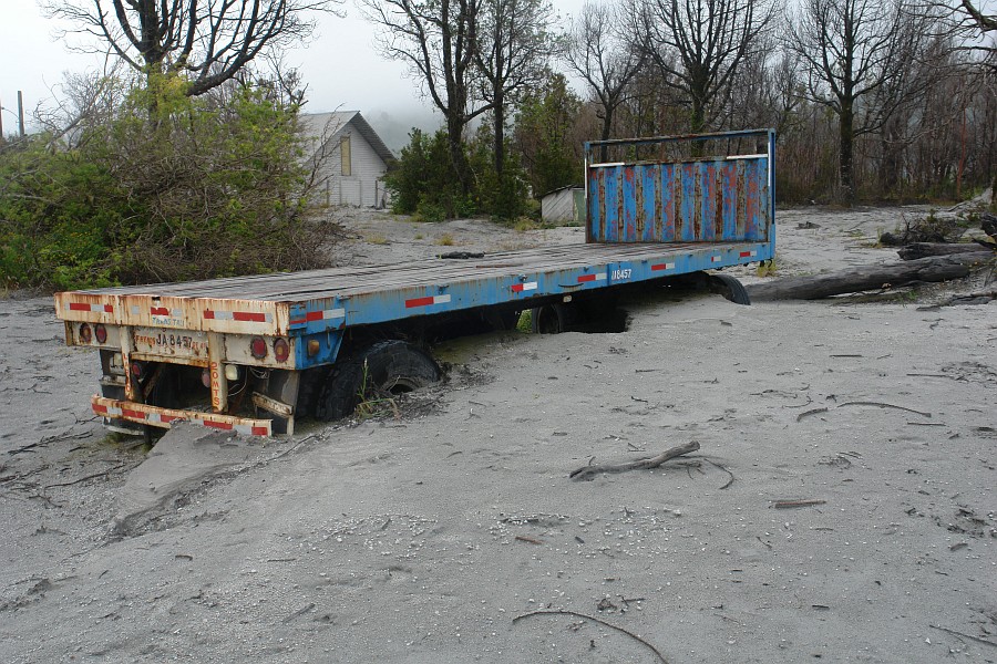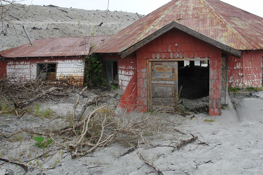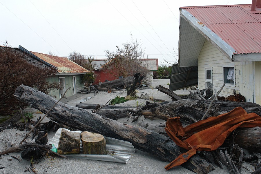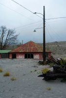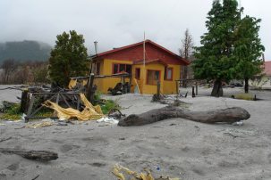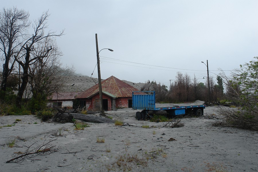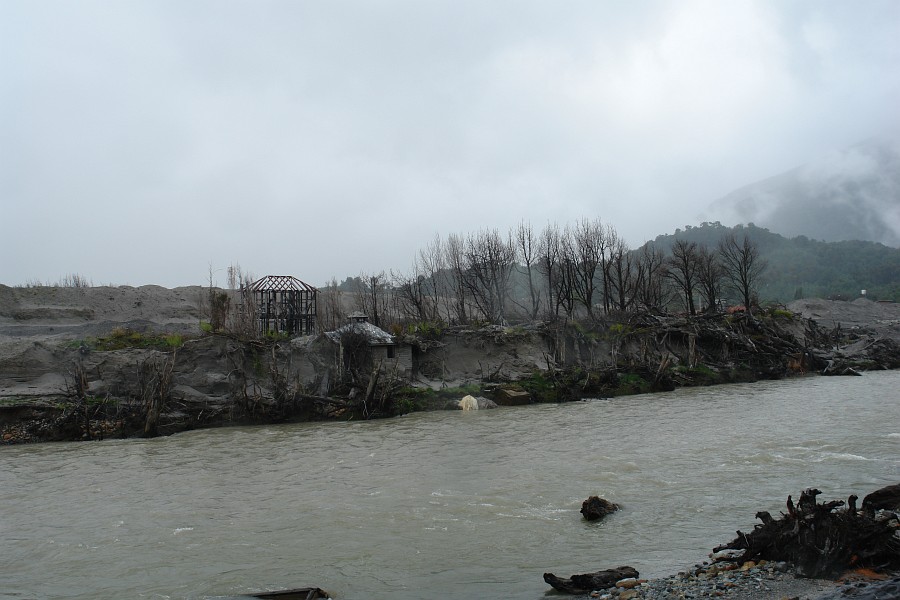 Ankunft in Chaiten: Die Stadt ist seit dem Vulkanausbruch des Volcano Chaiten am 2. Mai 2008 weitgehend verlassen. Der Vulkan war eigentlich als erloschen deklariert worden nachdem der letzte Ausbruch 9000 Jahre her gewesen war, aber 2008 ist er 10km vor Chaiten ausgebrochen und schleuderte Asche bis zu 20m in die Höhe. Innerhalb eines Tages war Chaiten von einer 20cm dicken Ascheschicht überzogen.