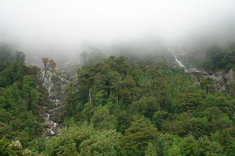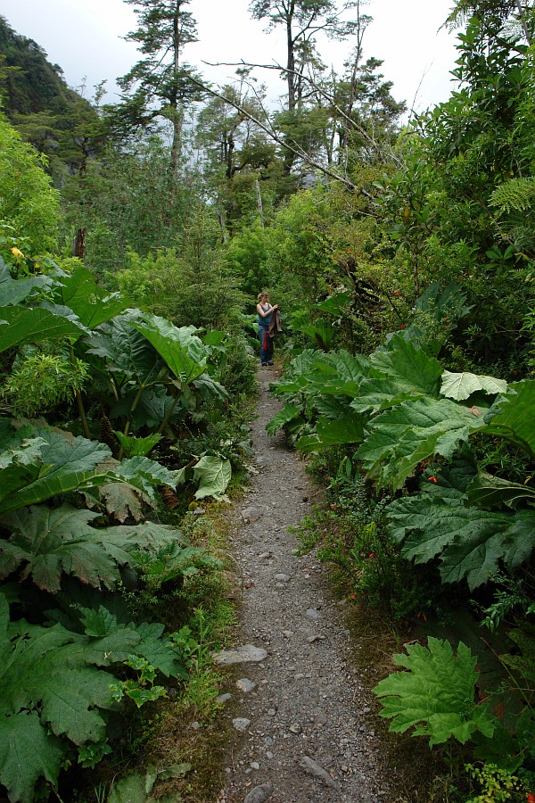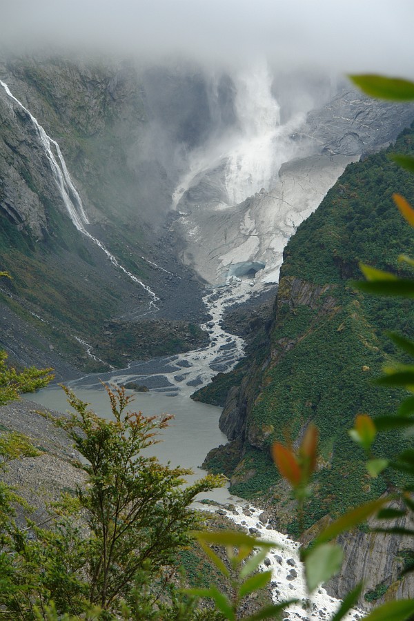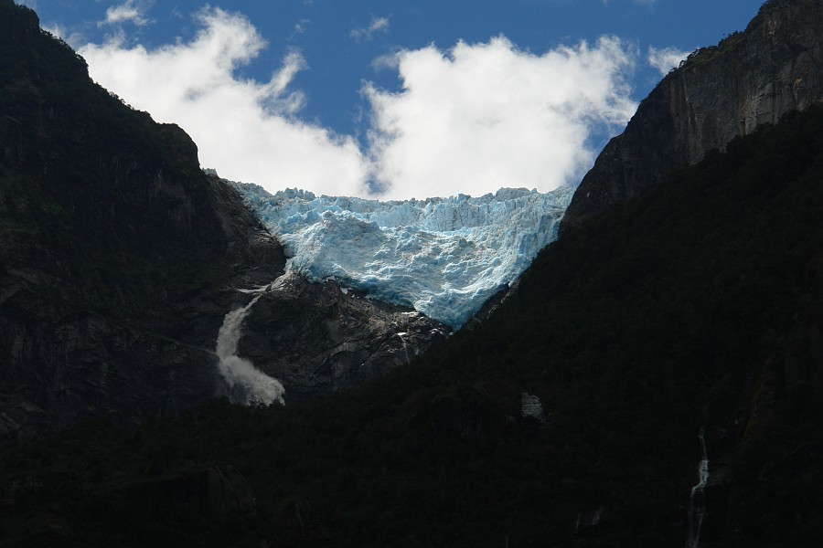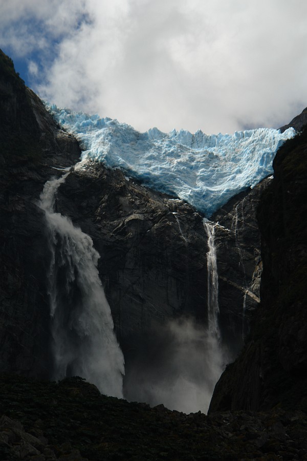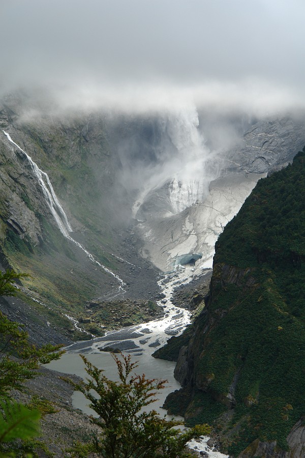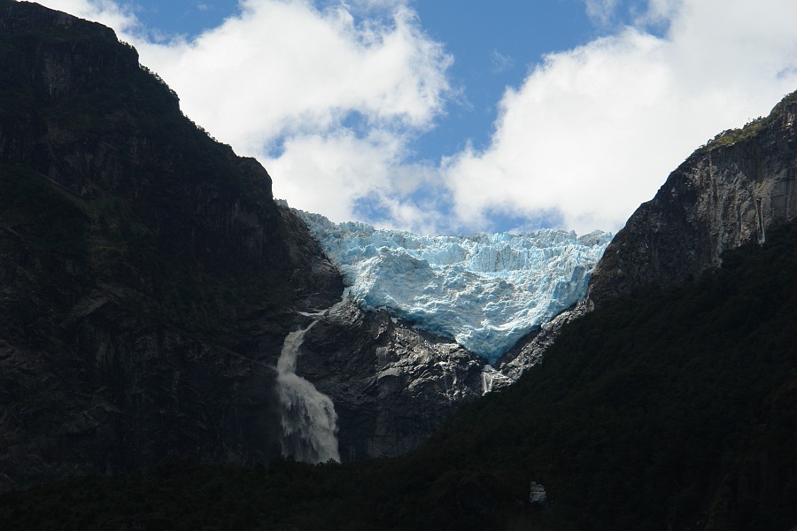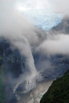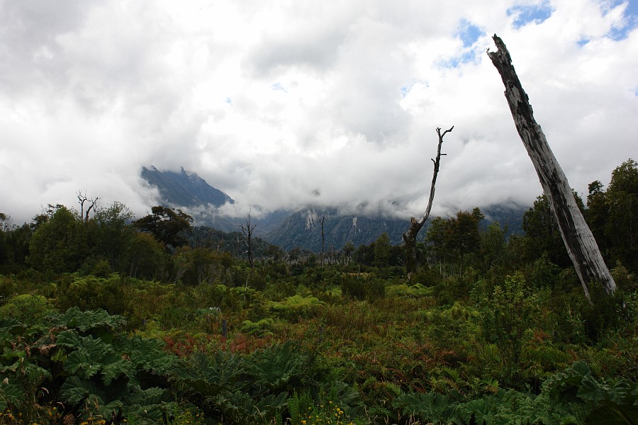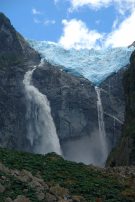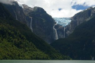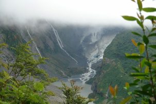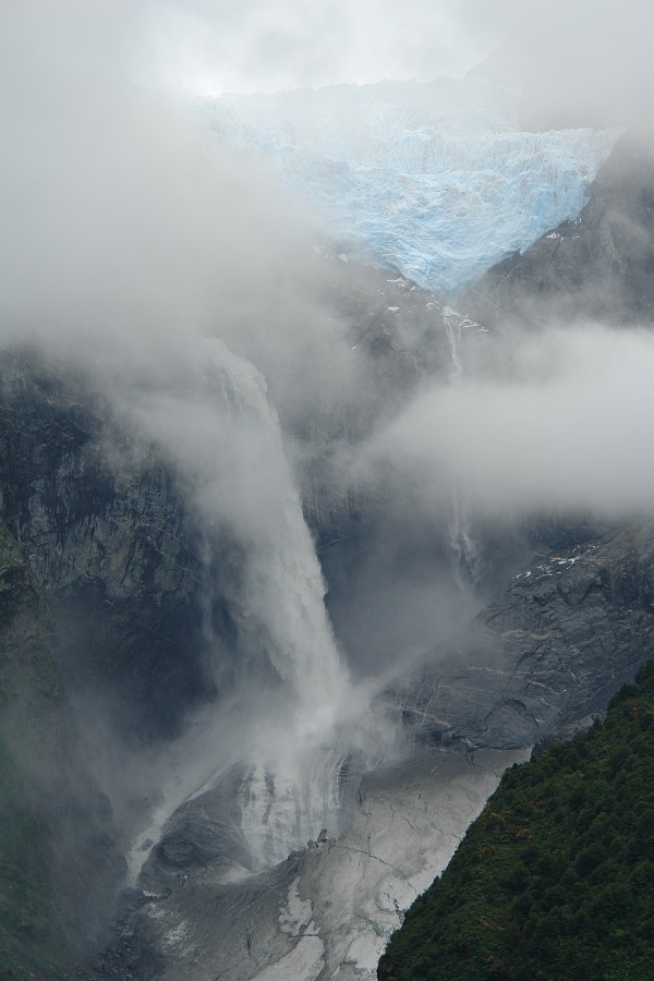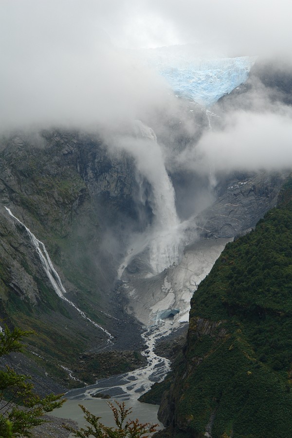 Nationalpark 'Queulat' mit dem Gletscher 'Ventisquero Colgante'. Dort sind wir fuenf stunden lang durch den Jungle gekraxelt, um zu einem Aussichtspunkt am See Laguna Tempanos zu gelangen -...wo sich dann nach einigem Warten die Wolken fuer ein paar Sekunden geoeffnet haben und uns Blick auf den Wahnsinns-Gletscher zu bieten.