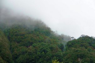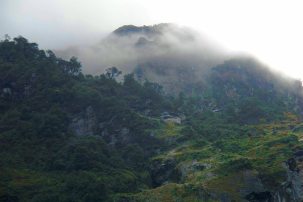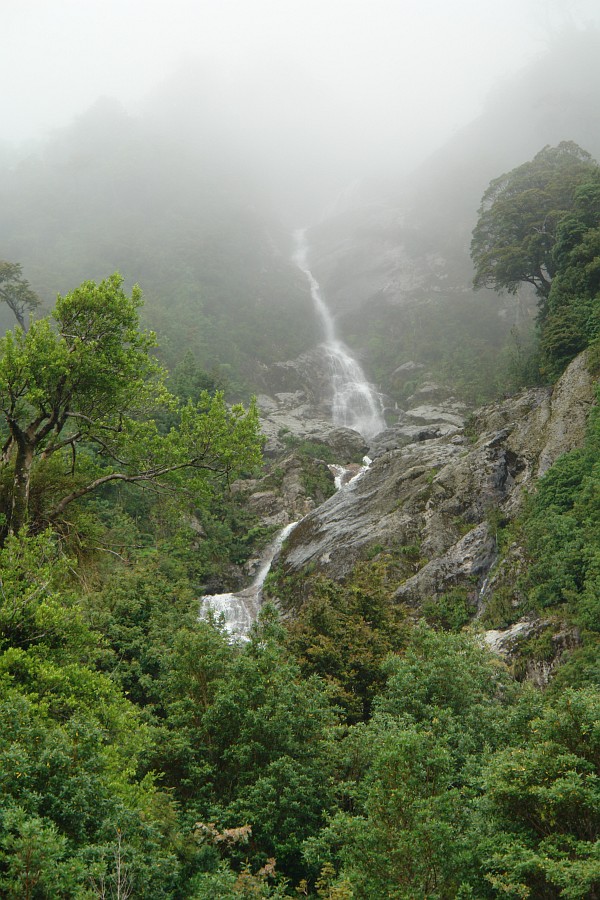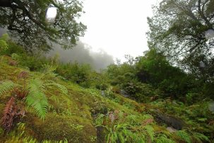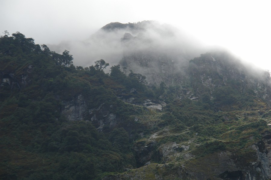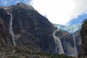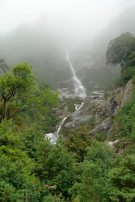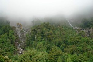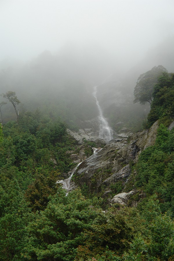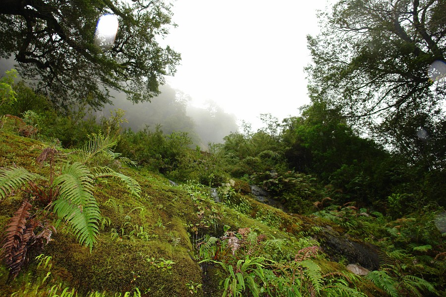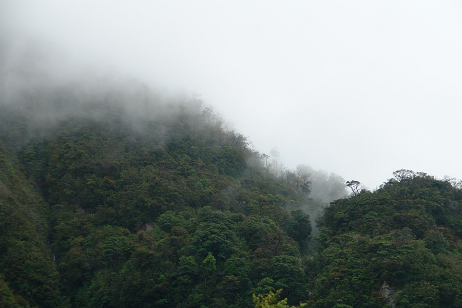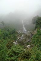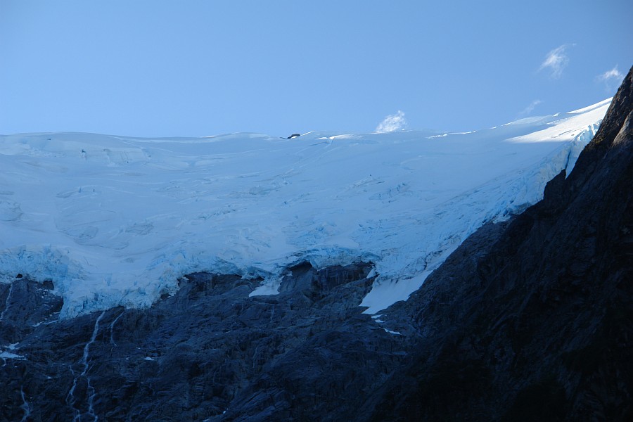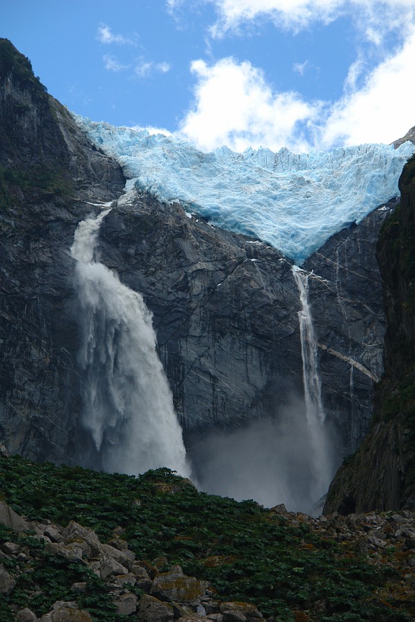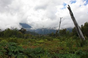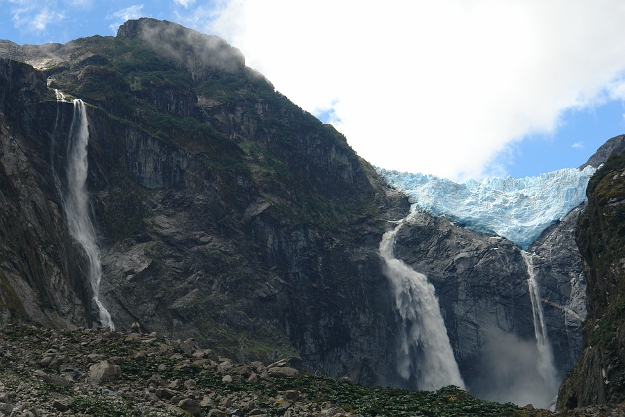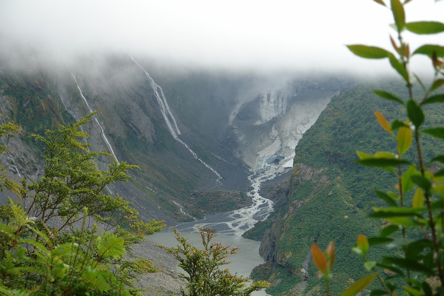 Nationalpark 'Queulat' mit dem Gletscher 'Ventisquero Colgante'. Dort sind wir fuenf stunden lang durch den Jungle gekraxelt, um zu einem Aussichtspunkt am See Laguna Tempanos zu gelangen -...wo sich dann nach einigem Warten die Wolken fuer ein paar Sekunden geoeffnet haben und uns Blick auf den Wahnsinns-Gletscher zu bieten.