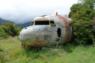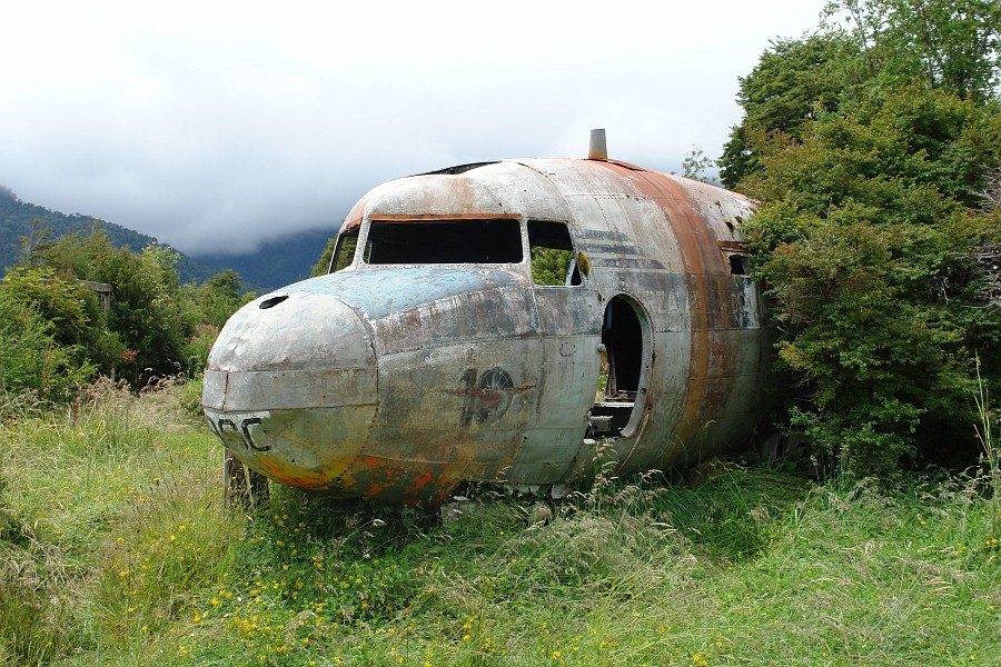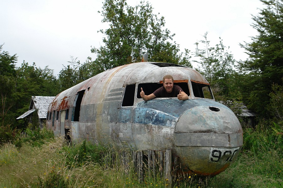 Wir fuhren von Chaiten entlang der berühmten Carretera Austral zu den Termas 'El Amarillo'. Dabei kamen wir an einigen Wasserfällen vorbei und an diesem alten Flugzeug.