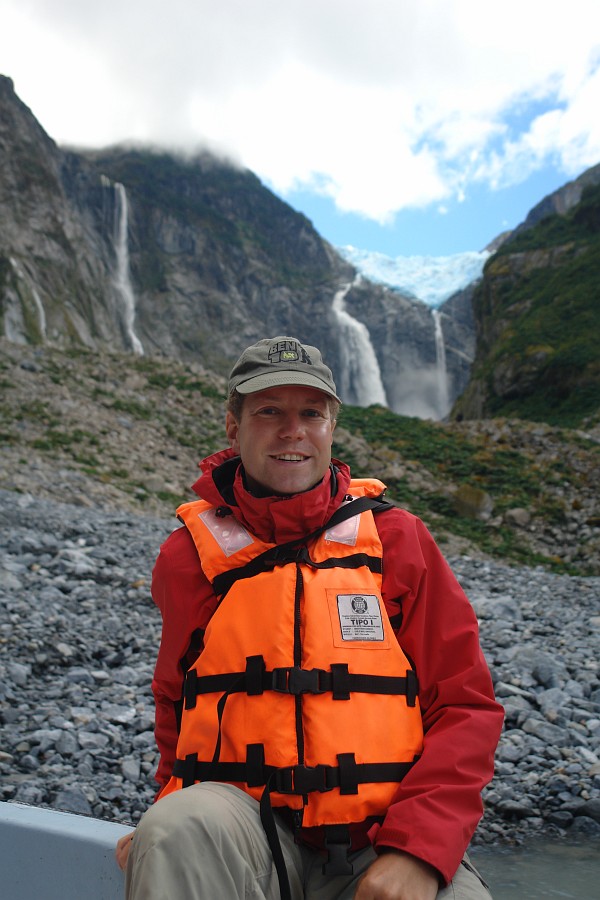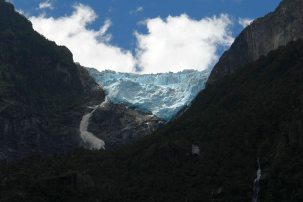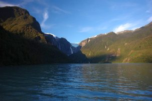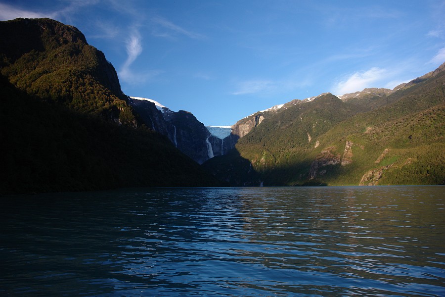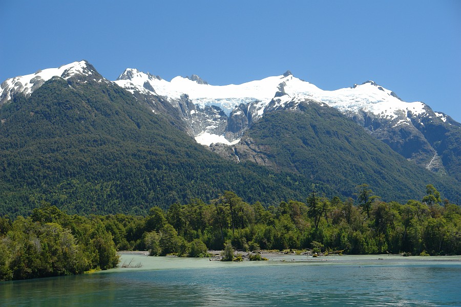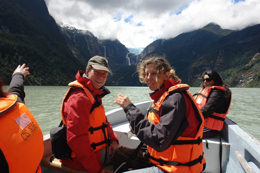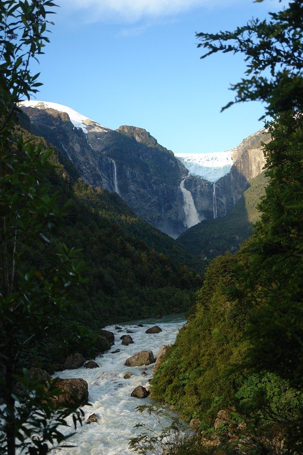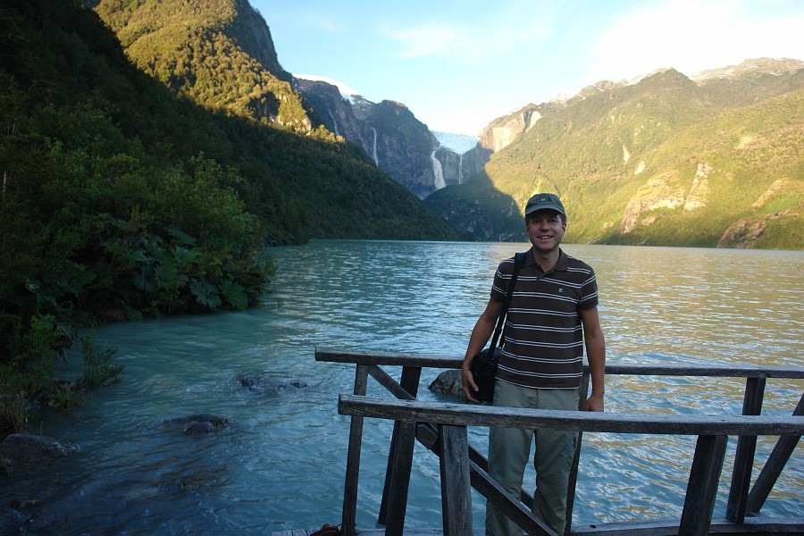 Nationalpark 'Queulat' mit dem Gletscher 'Ventisquero Colgante'. Wir fanden im Park einen netten Campingplatz, wo wir unser Zelt aufstellten. Ben konnte einem Spaziergang zum Tempanos-See noch vor dem Abendessen nicht wiederstehen. Dort gab es dann den riesigen Gletscher zu sehen.
