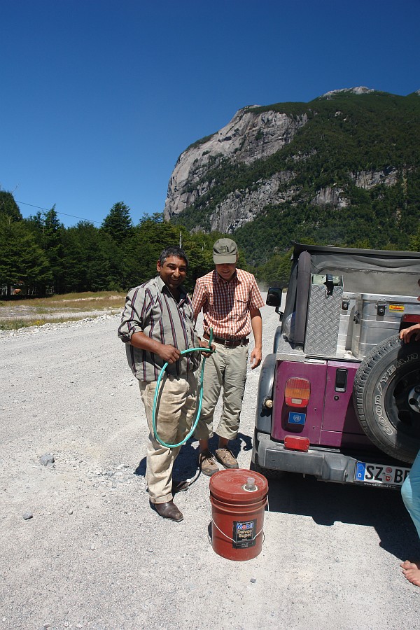 Die Gengenden rund um die Carretera Austral sind so abgeschieden, dass jeder gleich hilft, wenn er kann. Hier hatte uns ein Bauer gebeten ihm Benzin zu abzugeben, um bis zur naechsten Tankstelle fahren zu koennen..