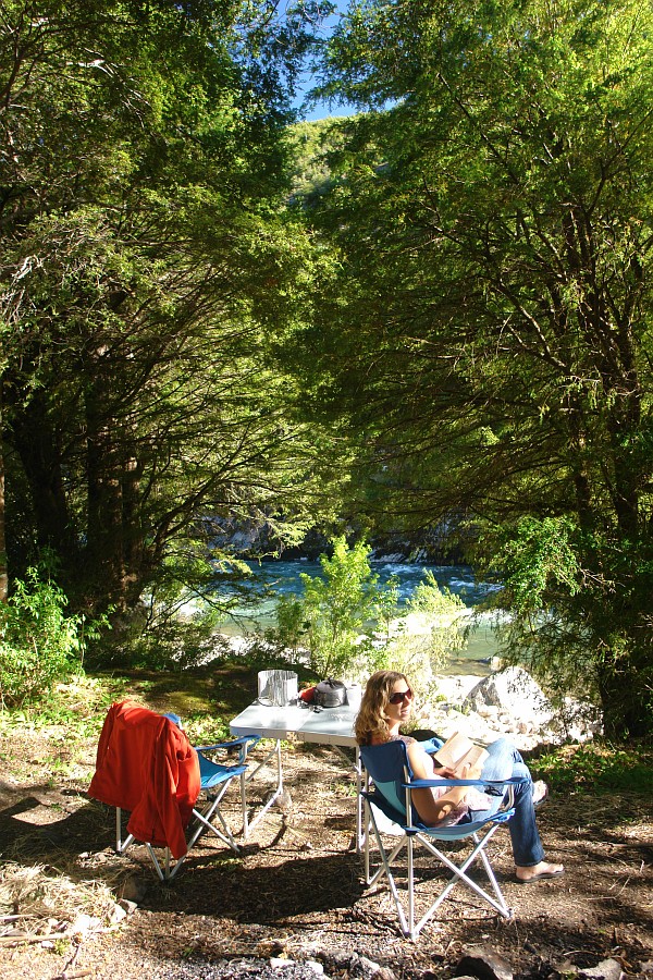 Ein paar Kilometer vor Coyhaique fanden wir diese versteckte absolut perfekte Campingstelle direkt am Rio Simpson mit frischem Wasser