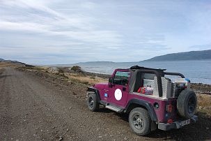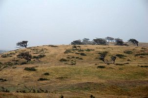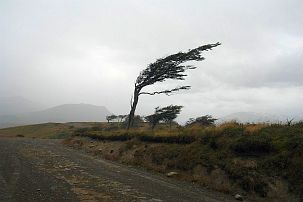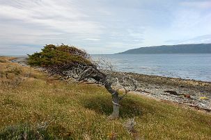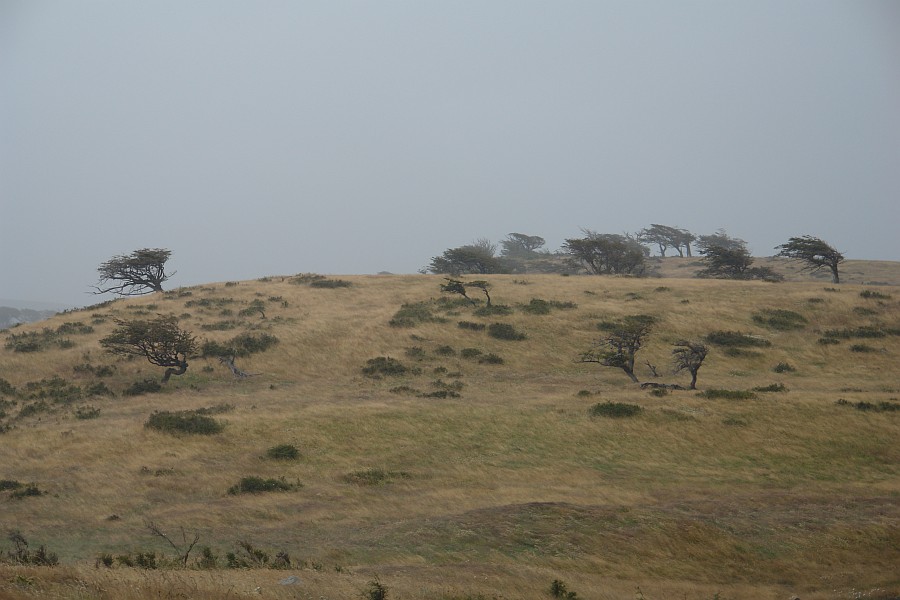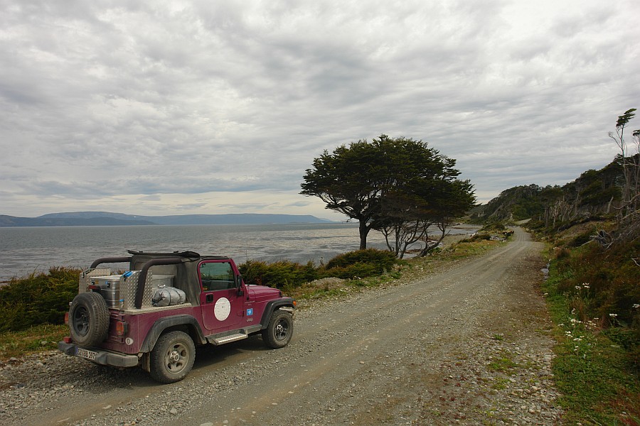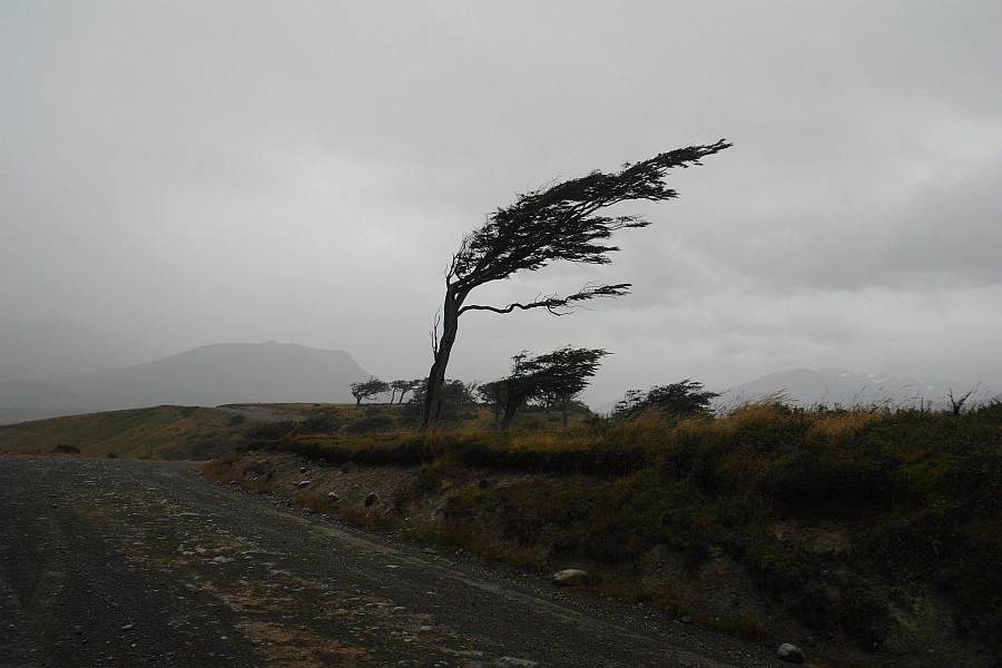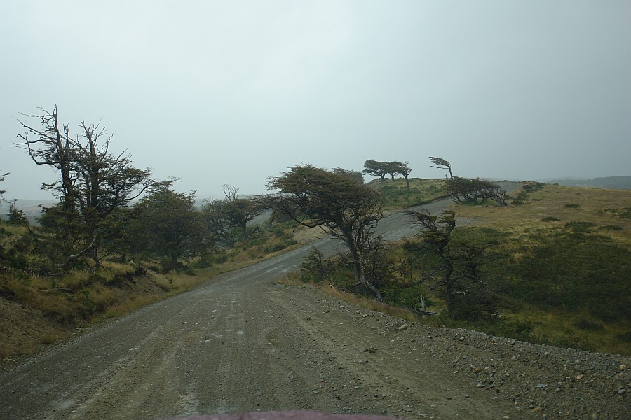 The next day we followed the road to its end. We headed for the most Southern point on the mainland that can be reached by 4x4 car. The strong wind mades trees grow inclined!