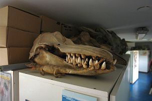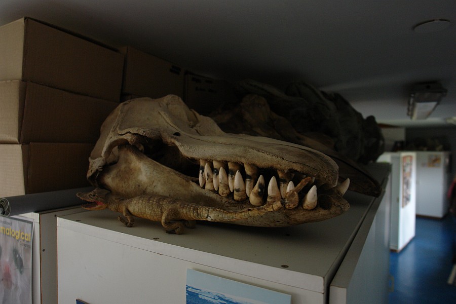 Vollkommen unerwartet gab es dort ein Museum fuer Meeressaeugetiere, Krokodile und andere Tiere. Die Fuehrungen werden von jungen Studenten durchgefuehrt, die dort Untersuchungen an den Knochen vornehmen. Weil wir die einzigen Gaeste waren, bekamen wir eine Privattour und durften sogar die Knochen anfassen. Wahnsinn!