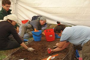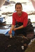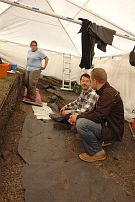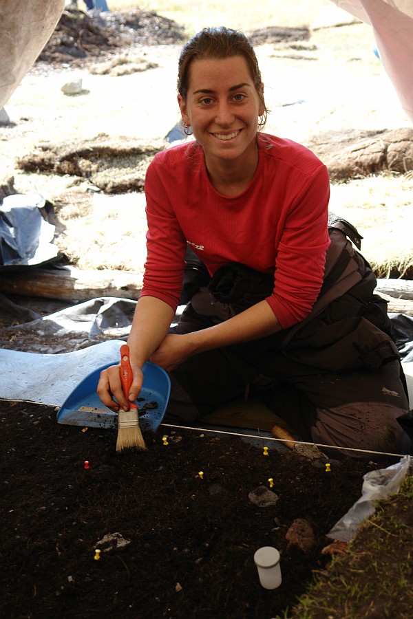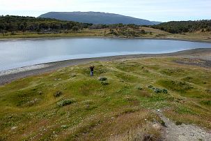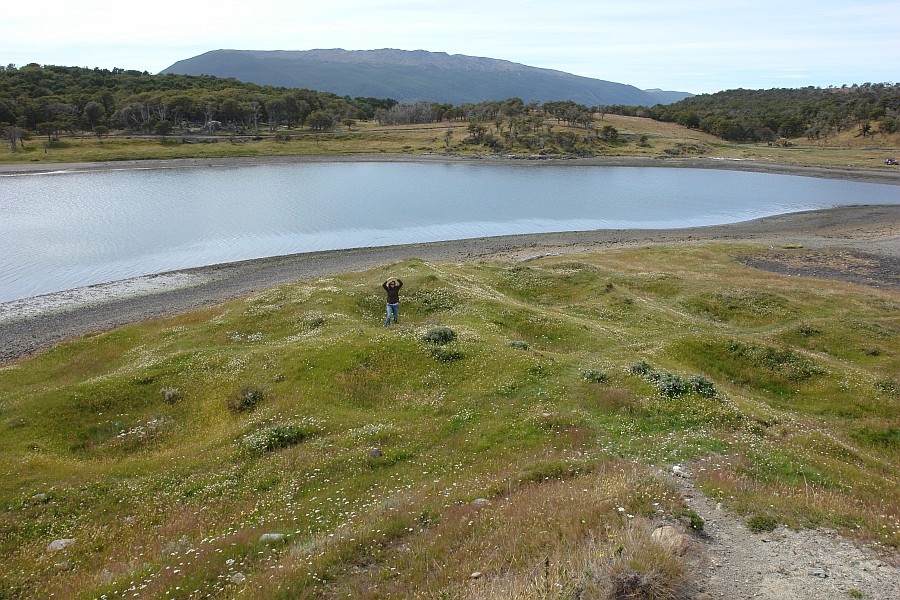 Auf dem Weg sahen wir ein Zelt von Archaeologen. Ivan, der das internationale Ausgrabungsprojekt leitet, begruesste uns gleich nett und gab uns spontan eine Fuehrung mit vielen Erklaerungen. Sie suchen nach Ueberresten von Lebensmitteln, die ihnen Aufschluss ueber das soziale Leben der Fuegianer geben. In der Naehe des Zelts gab es auch einen Huegel mit vielen kleinen Graeben. Diese sind durch die Essgewohnheiten der Fuegianer entstanden: Sie assen hauptsaechlich Muscheln, deren Schalen sie dann aus dem Zelt geworfen haben. Wenn der Stapel vor dem Eingang zu hoch war, drehten sie einfach das Zelt ein Stück.