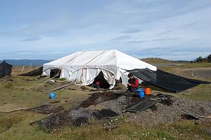 On our way we saw a tent of archeologists. There we met Ivan, who leads this international archeological excavation project. We were just hoping to be allowed a little insight into their tent, but were explained a lot and shown around. They are searching for leftovers of food in order to find out about the natives' social behaviour. Nearby the tent was a hill with many cavities. That was shaped by Fuegians: They mainly used to eat shells and throw the natural garbage out of the tents' entrances. Once the pile was too high, they just turned the tent.