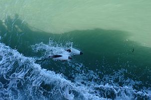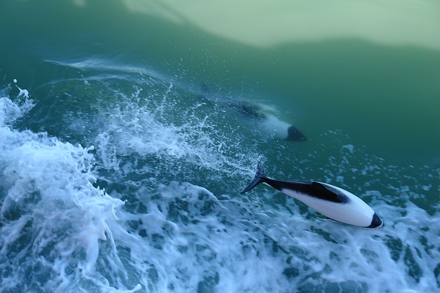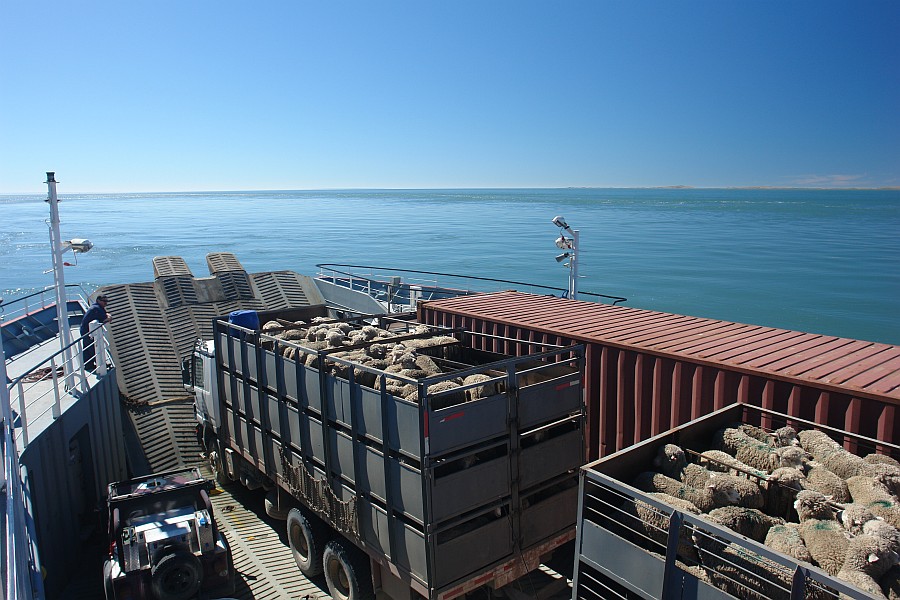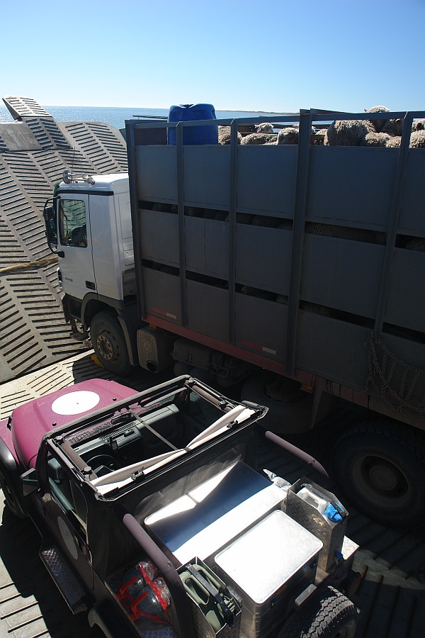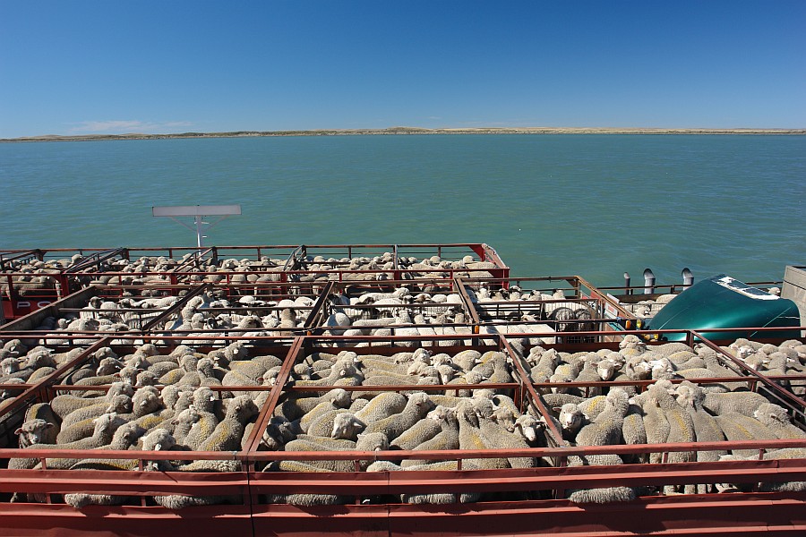 Um nach Punta Arenas zu kommen, mussten wir die Magellanstrasse nochmal kreuzen. Auf unserer Faehre waren viele LKW's, welche mit Schafen beladen waren. Was für ein Blick (und Gestank)! Diesmal hatten wir aber Glück und Schwarz-Weisse Commerson-Delfine schwammen mit uns. Sie sind die kleinste Walart der Welt. Und die Welt ist wirklich wahnsinning klein ... die Rettungsboote auf dem Schiff sind aus Escherhausen, ganz um die Ecke von Salzgitter wo Ben herkommt..