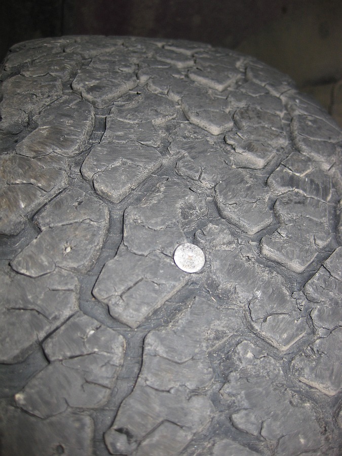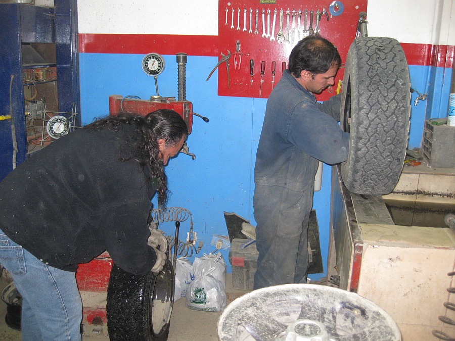 Wieder haben wieder mal eine Schraube in einem Vorderreifen entdeckt, was erklaert, warum wir gestern so viel Luft verloren haben. Eine 'Gumeria' loeste das Problem schnell und wir konnten unsere Reise ans endgueltige Ende der Welt weiterfuehren.